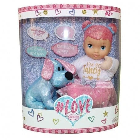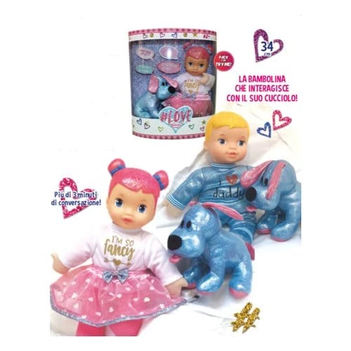 Bambola 34 cm Love, Bambolotto con Cagnolino Interattivo. Rocco Giocattoli Bambolina Love è una bellissima bambola interattiva educativa parlante, le bambole interagiscono con il cucciolo con conversazione fino a 3 minuti. Premi la manina della bambolina e la zampa del cagnolino ed inizieranno a parlare e cantare insieme!