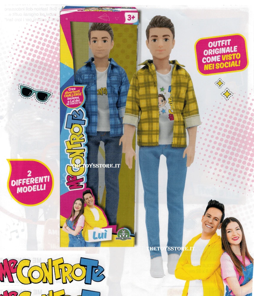 MecontroTe Lui fashion Doll, nuovo outfit ispirato ai loro Video nei social. Luì è vestito con una camicia a quadri, una maglietta con la stampa di Me Contro Te e jeans blu. La fashion doll è alta 30cm ed è compatibile con le altre versioni. +3 Anni.