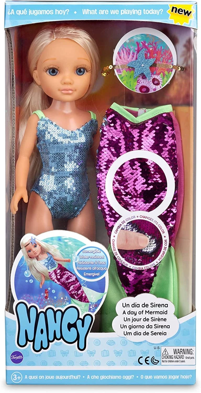 Nuova Bambola Nancy Sirena! Potrai Giocare facendole indossare la magica coda da sirena con paillette cambia colore, la bambola ha un bel costume da bagno ed ha due funzioni, Bambola fashion o Sirena. La fashion doll è alta 45cm ed è curata nei dettagli, divertiti a giocare con Nancy.