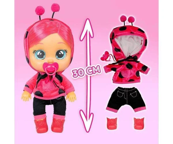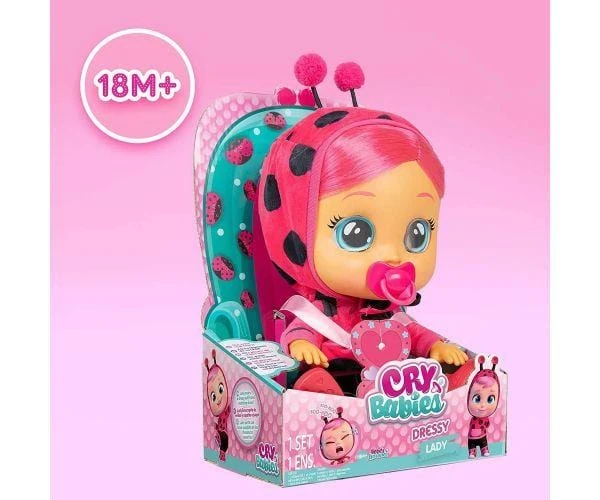Cry Babies Lady Dressy, nuova Bambola dotata di Capelli Veri e con grandi Occhi brillanti. Il Nuovo Bambolotto Lady 2.0 indossa abiti veri e piange lacrime come un vero Bebè, Lady è una Coccinella che ha bisogno del Ciuccio e delle tue cure. Togli il Ciuccio e la tua Cry Baby inizierà a piangere con lacrime vere e suoni realistici, rimetti il ciuccio e smetterà di piangere o cullala e smetterà di piagniucolare! Scopri tutta la linea di Nuove Bambole Cry Babies Dressy, i vestiti sono compatibili con tutti i bambolotti della linea CryBabies. +18 Mesi, pile incluse.