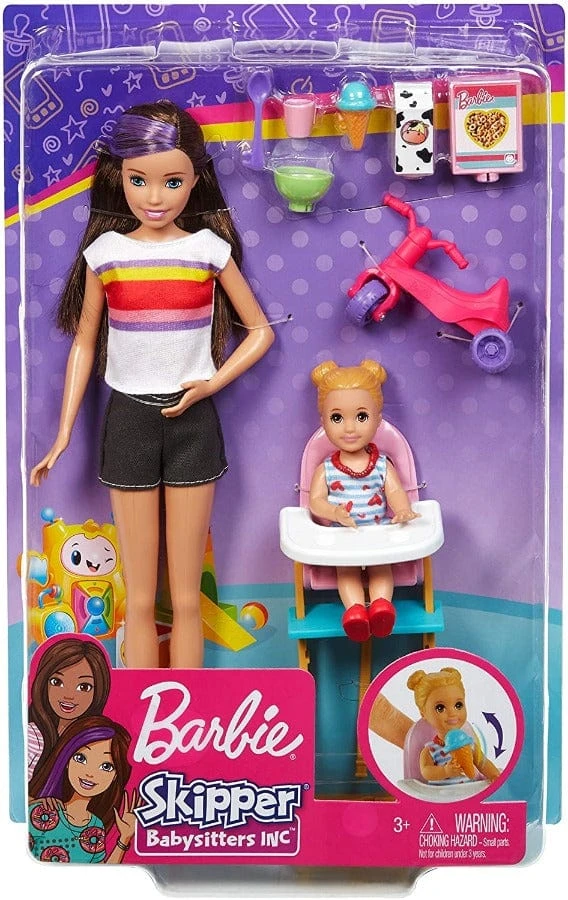 Barbie Babysitter Skipper con Bambola e Seggiolone Pappa, GHV87. Con la Bambola di Skipper che include questo playset di Barbie a tema Pappa con bambolina e accessori, il divertimento è assicurato! Gioca assieme a Skipper e alla piccola amica mentre le dà a mangiare. Accessori Inclusi, i giocattoli di Barbie stimolano l’immaginazione e la voglia di fare. +3 Anni.