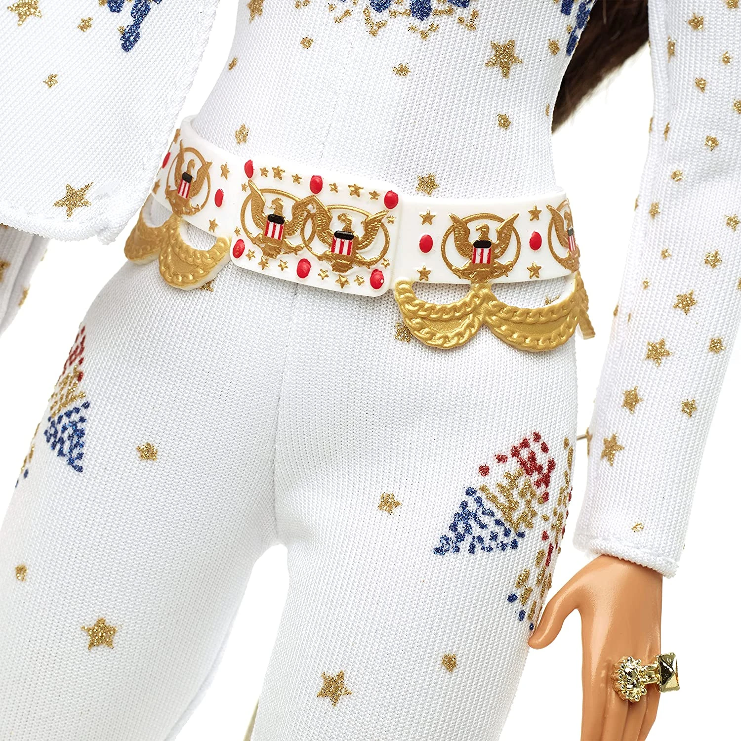 Barbie Bambola Ispirata ad Elvis Presley con Vestiti e Dettagli Realistici, se adori Elvis e la sua musica allora non puoi non avere la Barbie da Collezione più rock di sempre! La fashion doll è caratterizzata da una acconciatura Pompadour e indossa un outfit ispirato al re del rock con la sua tuta bianca American Eagle. L’abito è impreziosito da scintillanti aquile dai colori rosso, blu e oro, con mantello, sciarpa rossa, cintura e pantaloni a zampa di elefante. Gli stivali bianchi a punta e il caratteristico anello d’oro e turchese completano il look