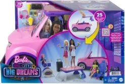 Barbie Big City Big Dreams Auto Musicale, l’immaginazione può mettersi in viaggio e rivivere avventure rock con questo playset trasformabile di veicoli di Barbie® ispirato a Barbie: Big City, Big Dreams™! Pronto a portare lo spettacolo on the road? Allaccia due bambole Barbie® (bambole vendute separatamente), quindi parcheggia e trasforma il veicolo per creare la scena per uno spettacolo pop-up! Lo scintillante SUV rosa è dotato di un tetto rimovibile che diventa un palcoscenico, sedili rimovibili che diventano posti a sedere per un pubblico e oltre 20 accessori per la narrazione tra cui una batteria e uno sgabello, altoparlante e giradischi, microfoni e altro ancora. Le future star dai 3 anni in su possono sognare tutti i tipi di grandi avventure con questo veicolo trasformabile di Barbie®! +3Anni