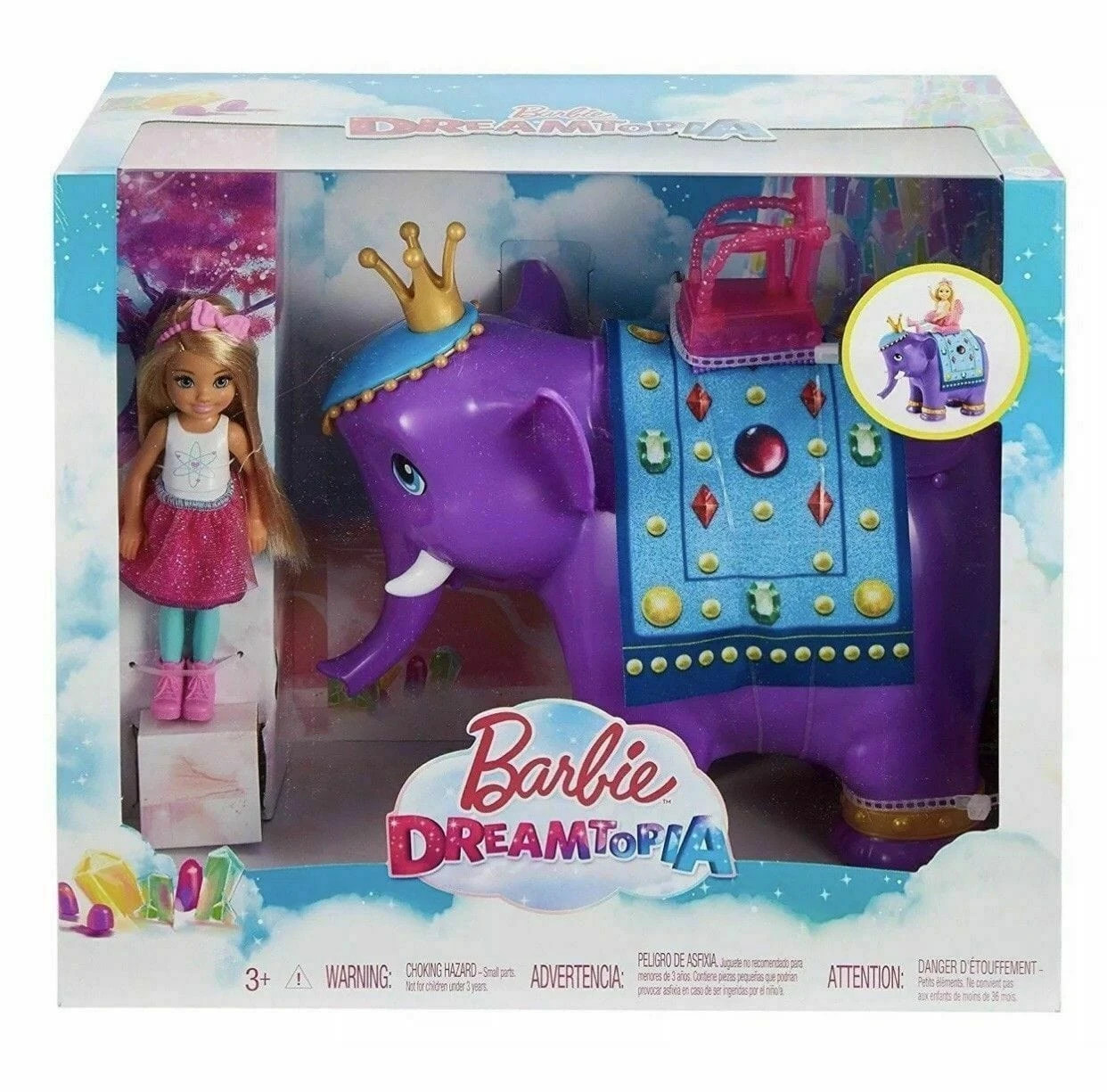 Chelsea può stare sulla schiena del suo amico Elefante, nei suoi piedi sono nascoste delle ruote perciò Basterà spingere per entrare in una storia fantastica. L’elefante viola ha un aspetto molto maestoso grazie alla corona dorata, ha molti dettagli in oro e a una coperta decorata con “gioielli”. Chelsea brilla nella sua maglia bianca con decori nella gonna brillante e rimovibile in rosa, collant turchese dipinti, scarpe e fascia per capelli con fiocco rosa. Con Dreamtopia i sogni di Barbie e Chelsea diventano realtà.