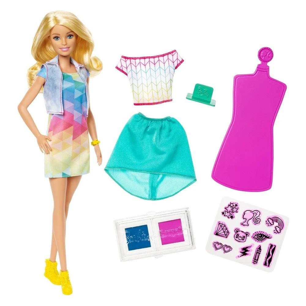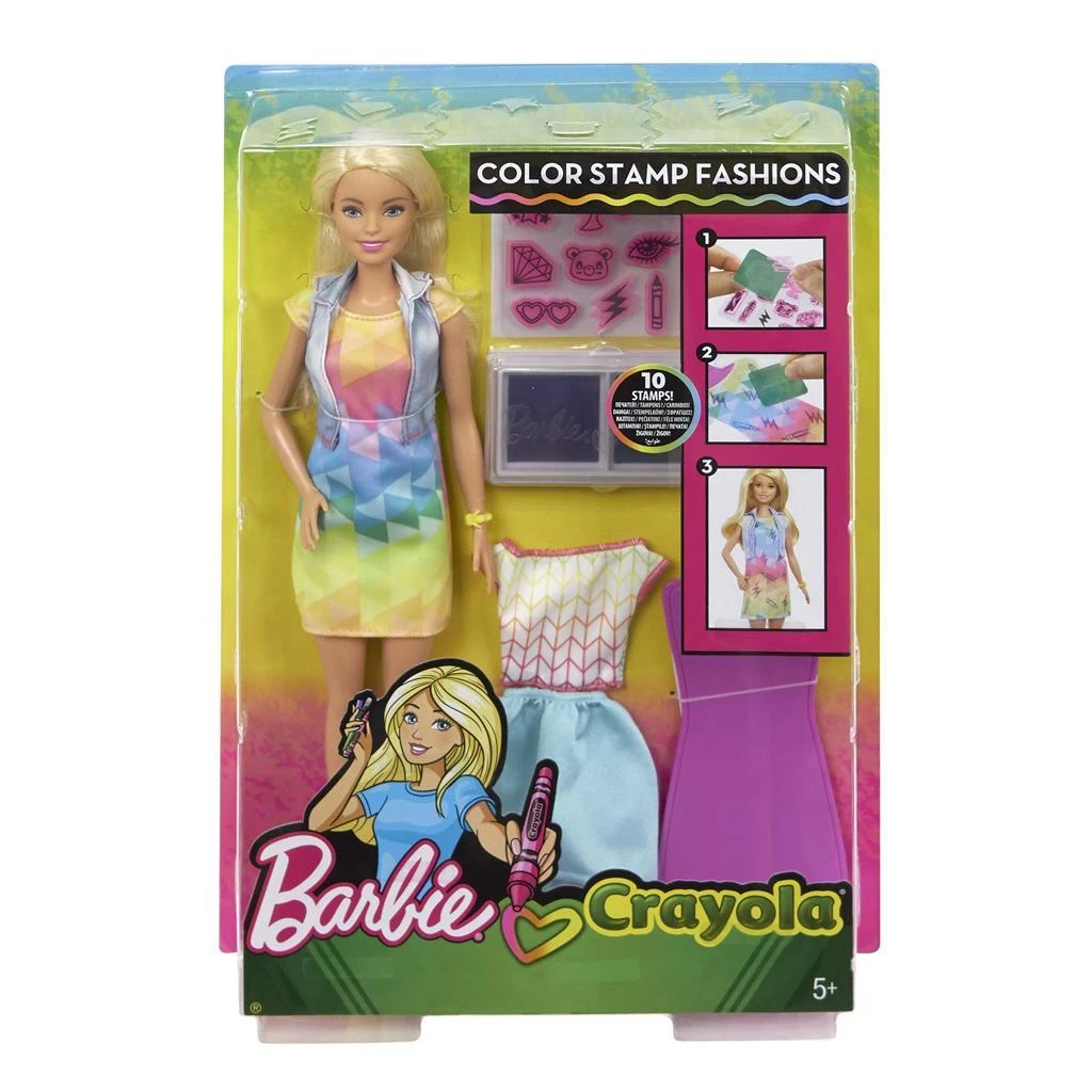 Barbie Crayola Stamp Fashion, con questo kit e gli accessori si possono creare vestiti unici. Questo playset include 4 abiti lavabili e 10 stampini unici. Posiziona il timbro scelto nel maker, aggiungi l’inchiostro di uno dei due colori (viola o blu) e applica il timbro all’abito. Stampa quate volte lo desideri, i vestitini sono lavabili.